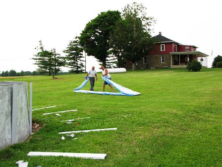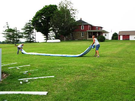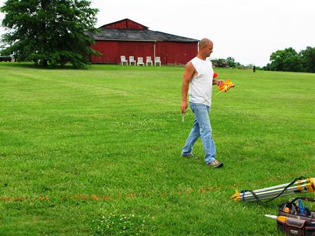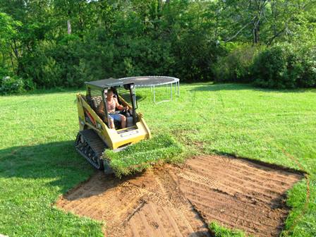 The first step is to lay the pool out and paint in down on the ground. Once that is done we start peeling off the sod and then leveling out the hole. Very important to get the hole as level as possible. We get the hole to within 1 1/2 inches of level, closer if possible. Once the hole is flat we repaint down the pool and start laying out the bottom track and putting it together.