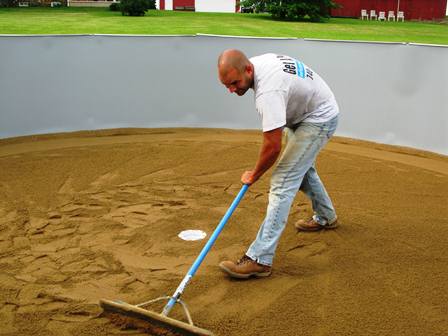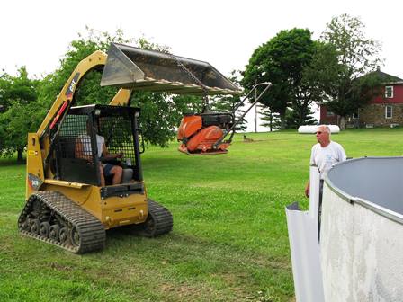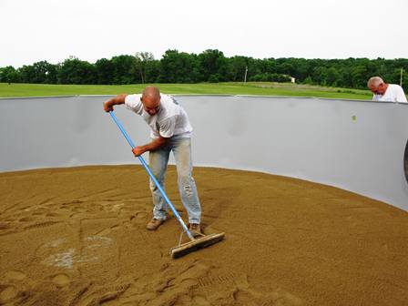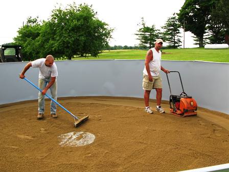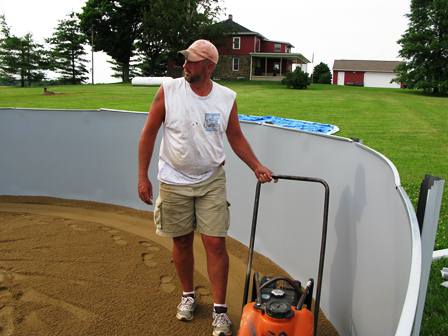 Now that the wall is up the process of smoothing out and compacting the sand bottom is started. We compact the sand twice in this process. It is impossible to get a perfectly flat and smooth bottom when dealing with sand. We feel that the process we use is the best in Central Ohio in attempting to get the bottom smooth. While the sand is being done on the inside of the pool, a guy on the outside will be putting on uprights and setting up the shop vac we use to suck the liner in place. The guys on the outside also get the liner out of the box and prefold it so it is ready to drop in the pool. Once the sand is finished the plate compactor and fellas are lifted out of the pool.