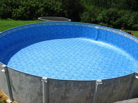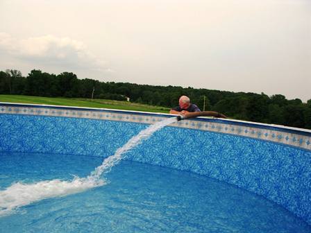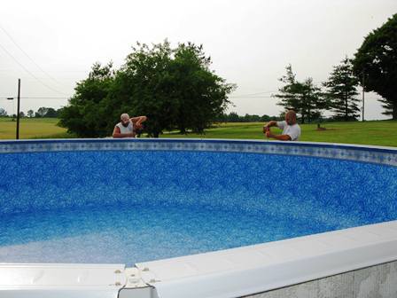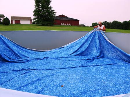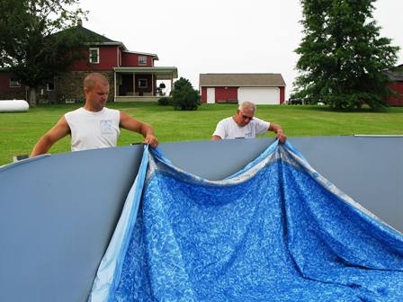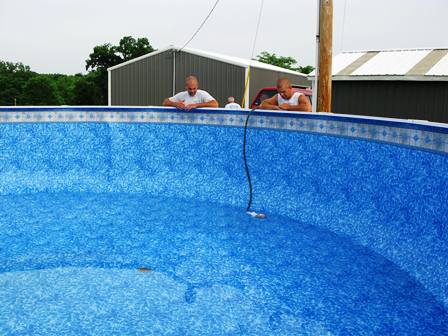 Liner time!! We install the liner completely from the outside. Once we drop it over the wall we start hanging it in place. Once we have went all the way around the pool we make sure that the liner is stretched right. You do not want the liner to loose in spots and stretched tight in others. It needs to be evenly spaced around the top. Turn on the shop vac and let it start to pull the air from behind the liner as it is tapped into place. No wrinkles. Start the water.