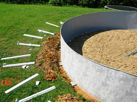 Once the bottom track is put together we stake everything to the dimensions it is supposed to be. First rule of construction; plumb, level, square. We bring the sand for the pool bottom into the hole and level the patio blocks that go under each upright base. You want the blocks to be sunk into the ground as much as possible. This is why it is very important to get the hole as level as possible. Once the blocks are level the wall is installed into the track. We lay out the uprights and topseat pieces around the pool perimeter for easy access when we need them.